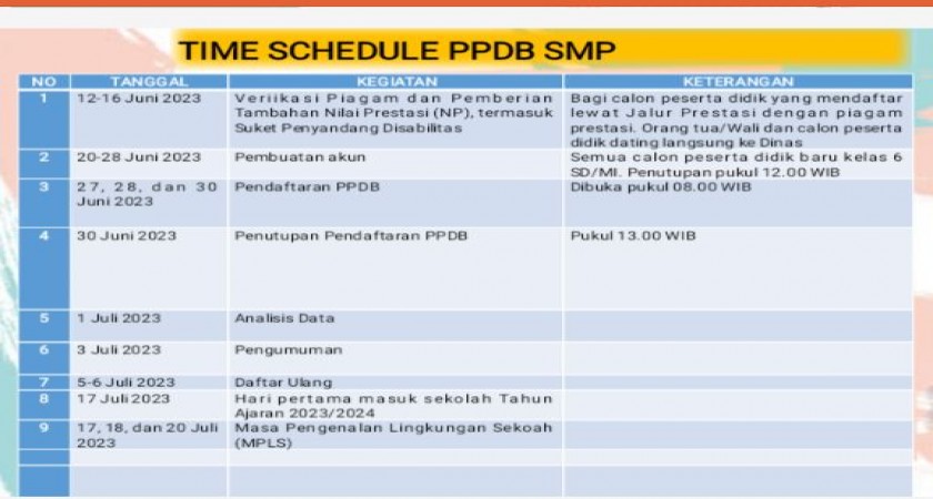 PPDB SMP Tahun Ajaran 2023/2024 segera dimulai dan dilaksanakan sistem Daring . Bagi adik-adik calon peserta didik baru mari mulai mempersiapkan diri sebaik mungkin beserta berkas yang